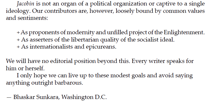 about ’s launch manifesto. That manifesto includes the following text:Tutt’s tweet focused on the emphasis on libertarian socialism (an emphasis Jacobin shared with Current Affairs - Nathan Robinson still explicitly positions himself within libertarian socialism).